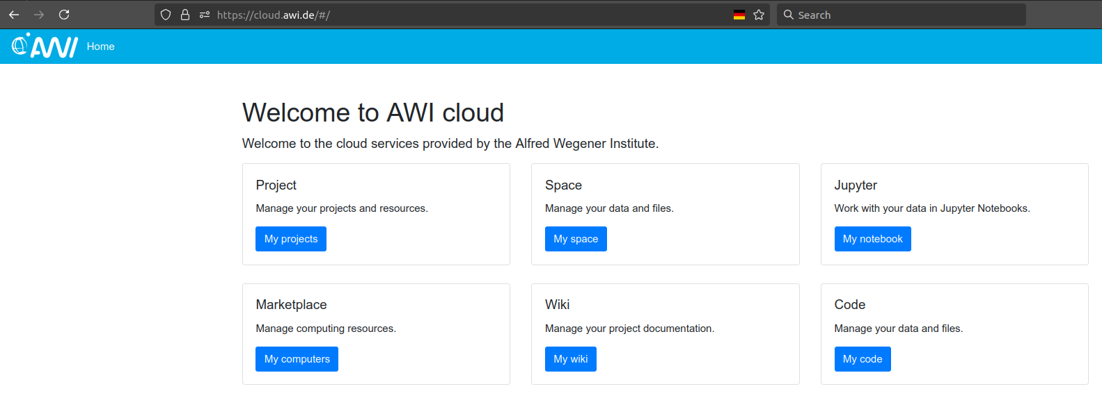 Go to cloud.awi.de, click the marketplace (see figure), choose dmawi as the AUTHENTICATOR !!!!!!, use your AWI credentials to login, and finally select the service broker